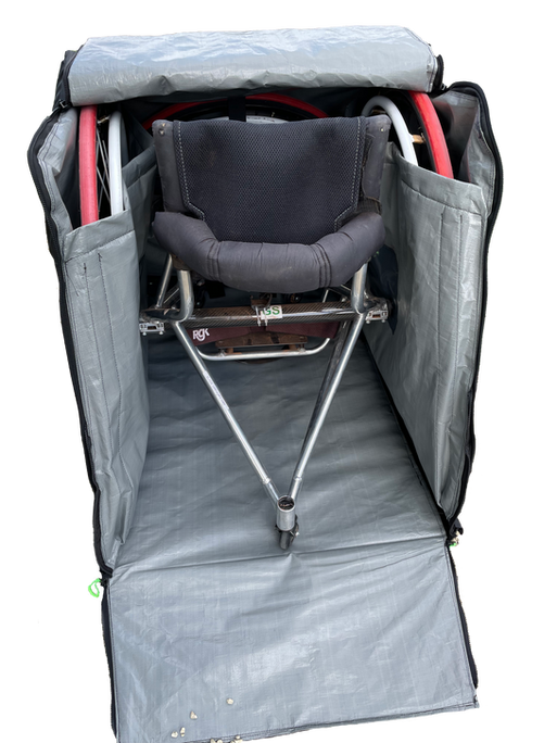 Designed specifically for tennis wheelchairs. The padding and rigid base offers peace of mind when travelling, preventing knocks and scrapes. Ideal for transportation on planes or storing wheelchairs safely. Easy to add and remove chair with ramp.